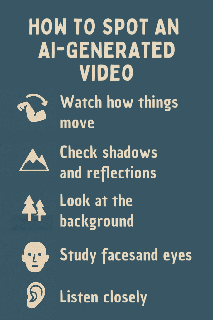 Even the most convincing AI clips leave subtle clues. Here are five key signs to look for when you’re unsure whether a video is real or synthetic: